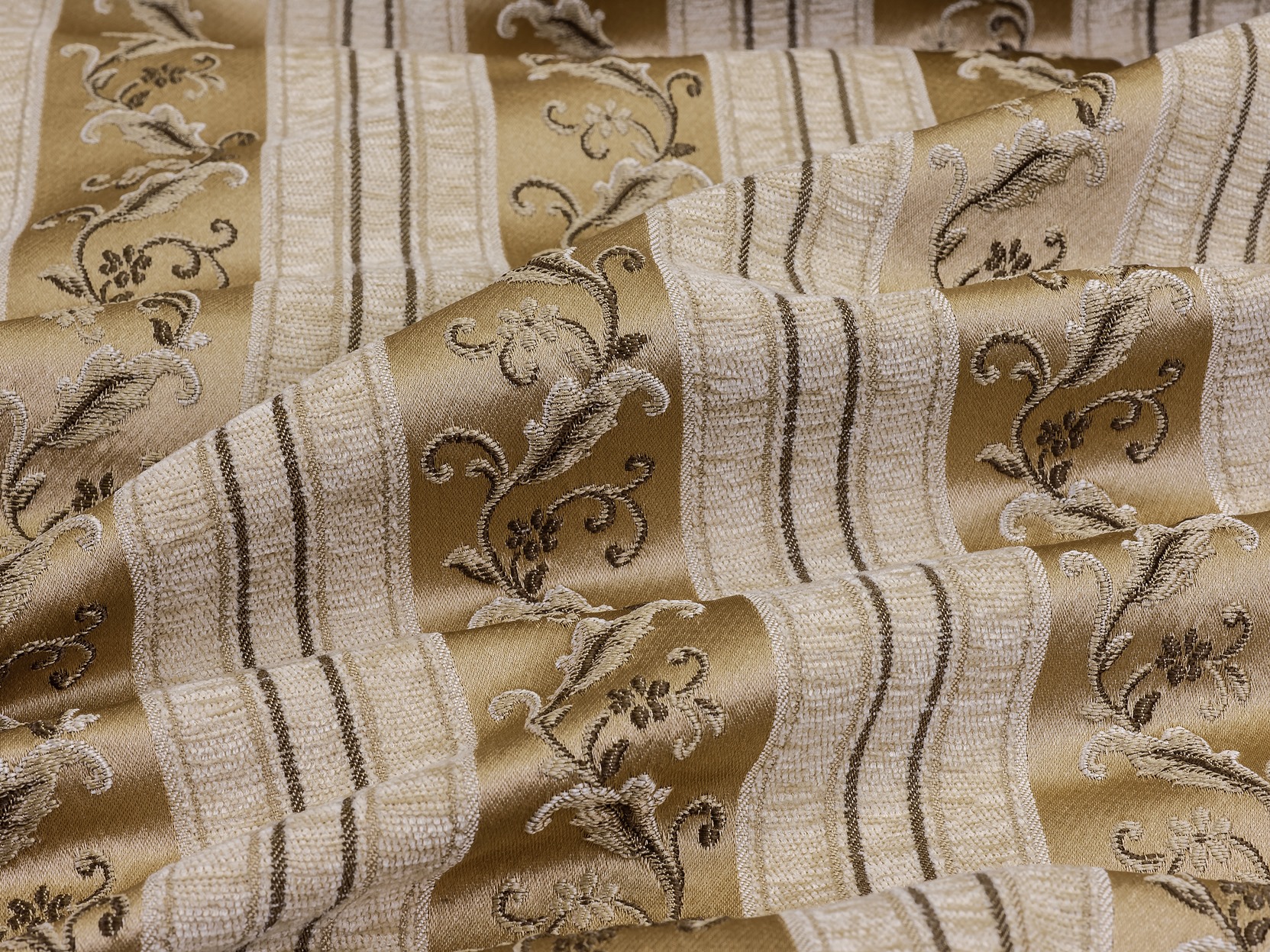 Материал не садится после обработки водой, отличается высокой эластичностью и не мнётся, долго держит цвет, абсолютно не линяет и обладает приятной бархатистой структурой, на ощупь напоминающей вельвет. Оригинальности коллекции придаёт мелкий графический компаньон, разбавляющий грациозность цветочных вензелей. Колористическая карта представлена в 5 различных решениях, включающих в себя серо-голубой, кремово-карамельный и кофейно-золотистые оттенки, способствующие созданию в интерьере уверенной спокойной обстановки, так необходимой жителям современного мегаполиса. Благодаря вплетению нитей различных оттенков, внешняя фактура ткани переливается благородным блеском, а мягкость материала приятно удивит даже самых искушённых дизайнеров.